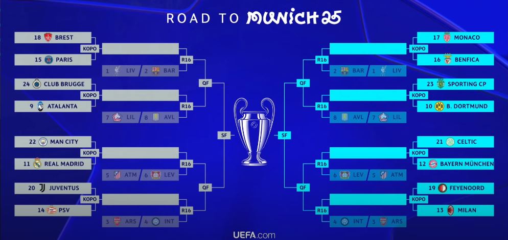 أسفرت قرعة الملحق لدور الـ 16 من دوري أبطال أوروبا اليوم الجمعة 31 جانفي 2025 عن قمة نارية ستجمع بطل النسخة الماضية ريال مدريد بمانشستر سيتي وفي ما يلي مباريات الملحق من دور الـ16 لدوري أبطال أوروبا مانشستر سيتي – ريال مدريد بايرن ميونيخ – سلتيك اتالانتا – كلوب بروج ايندهوفن – يوفنتوس فاينورد – ميلان باريس سان جيرمان – براست بنفيكا – موناكو دورتموند – سبورتينغ لشبونة