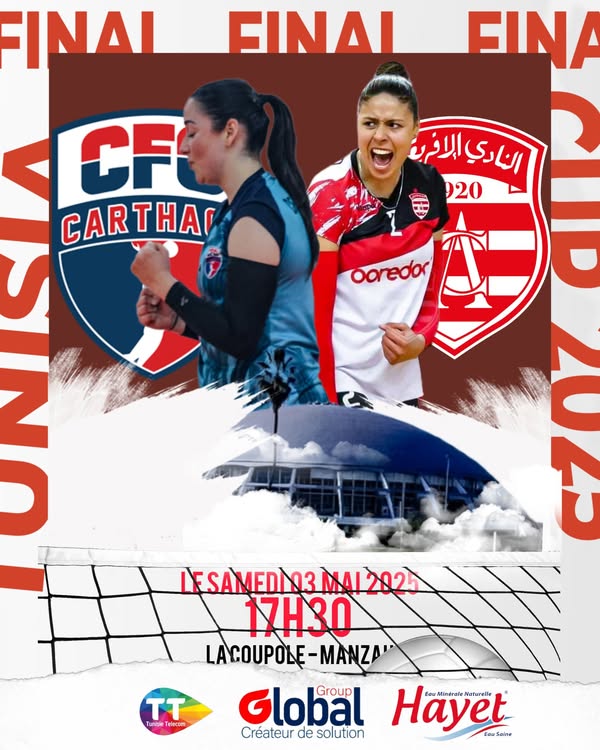 يقام نهائي كأس تونس للسيدات للكرة الطائرة يوم السبت القادم 3 ماي 2025 في الساعة الخامسة و النصف مساء بقصر الرياضة بالمنزه بين النادي الإقريقي و النادي النسائي بقرطاج