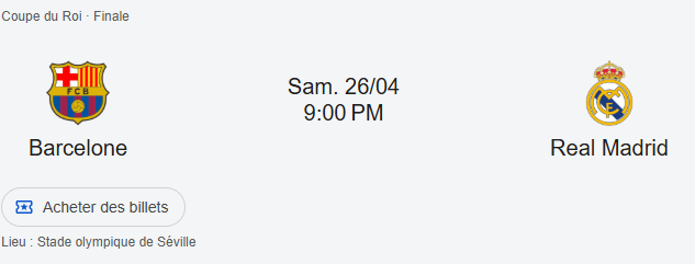 في موعد جديد بين الغريمين و في نهائي كأس ملك اسبانيا لكرة القدم يوم السبت 26 أفريل 2025 يلاقي برشلونة ريال مدريد في 10:00 ليلا بتوقيت تونس على ملعب لا كارتوخا في مدينة إشبيلية وستكون المباراة الأولى بين الفريقين في المسابقة منذ عام 2014 حيث يترقب عشاق الكرة مواجهة الكلاسيكو بين القمتين في نهائي كأس ملك إسبانيا التي تشهد صراعًا فرديًا بين نجوم البارسا على الكرة الذهبية، في وقت تضاءلت فيه حظوظ لاعبي الريال، وعلى رأسهم كيليان مبابي رافينيا يتصدر المشهد بأداء استثنائي (30 هدفًا و23 تمريرة حاسمة)، ويلاحقه الواعد لامين يامال (14 هدفًا و22 تمريرة حاسمة) في حين يغيب ليفاندوفسكي للإصابة بعد تسجيله 40 هدفًا هذا الموسم بالمقابل، تراجع بريق مبابي وفينيسيوس بعد خروج الريال من دوري الأبطال، فيما يبرز عثمان ديمبلي كمنافس قوي من باريس سان جيرمان بأرقام لافتة (32 هدفًا و11 تمريرة حاسمة) مع فرص حقيقية للتتويج الأوروبي الكلاسيكو قد لا يحسم السباق، لكن سيكون له تأثير كبير في رفع أسهم المتألقين